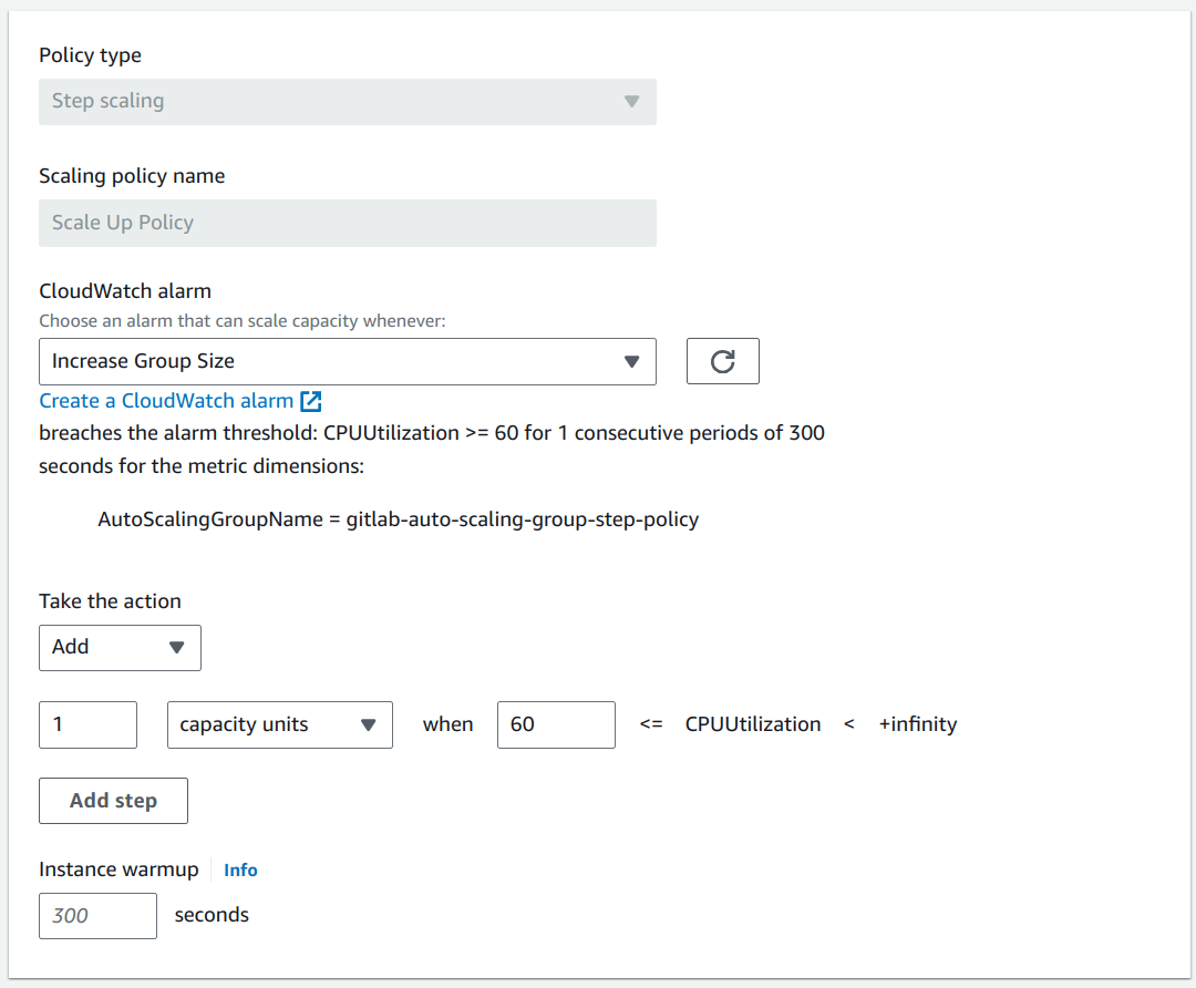 9. After the auto scaling group is created, we need to create a scale up and down policy in Cloudwatch and assign them.