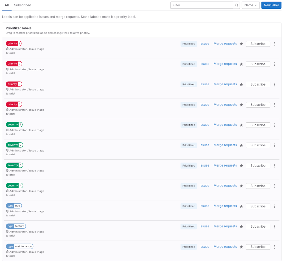 - Prioritize all the labels you created previously. Make sure that labels of higher priority and severity are higher on the list than the lower values.